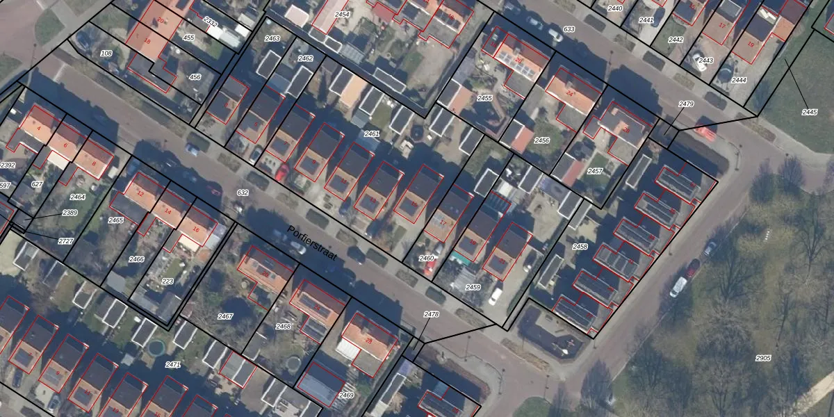 Porfierstraat 15 is gelegen op kadastraal perceel DTN01G2461. Deze kadastrale aanduiding is uniek en wordt gebruikt door het Kadaster om eigendomsrechten en andere zakelijke rechten vast te leggen. Het perceel maakt onderdeel uit van de kadastrale gemeente Dronten.