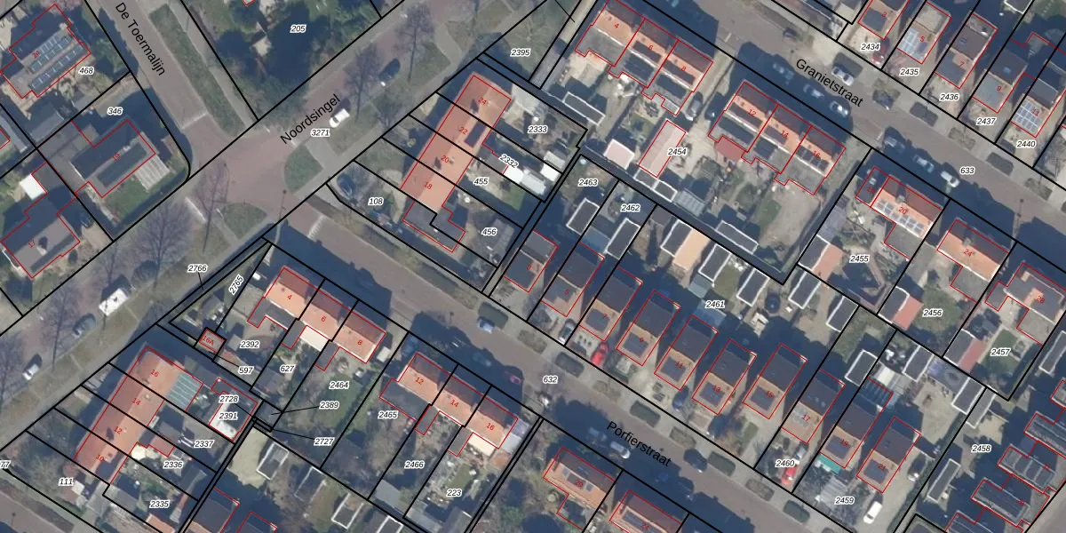 Porfierstraat 3 is gelegen op kadastraal perceel DTN01G2463. Deze kadastrale aanduiding is uniek en wordt gebruikt door het Kadaster om eigendomsrechten en andere zakelijke rechten vast te leggen. Het perceel maakt onderdeel uit van de kadastrale gemeente Dronten.