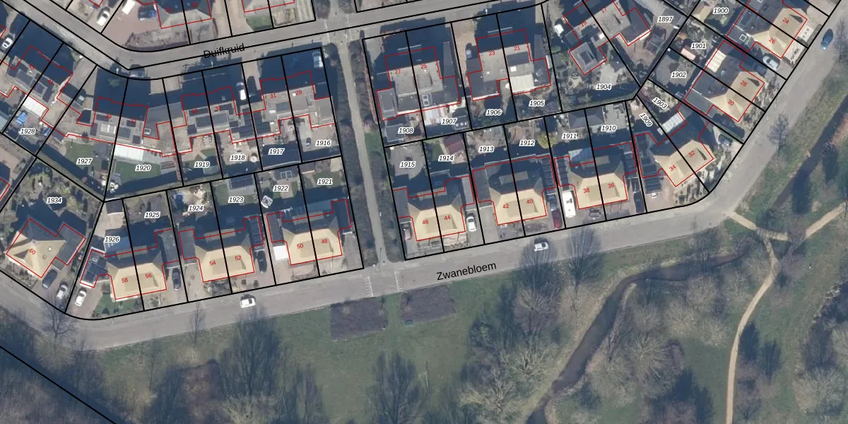 Het perceel waarop Zwanebloem 46 staat heeft een oppervlakte van 250 m². Dit is een middelgroot perceel. De perceeloppervlakte wordt geregistreerd door het Kadaster. Gedetailleerde informatie over de maten van dit perceel kunt u vinden in het rapport Kadastrale kaart met maatvoering van Zwanebloem 46.