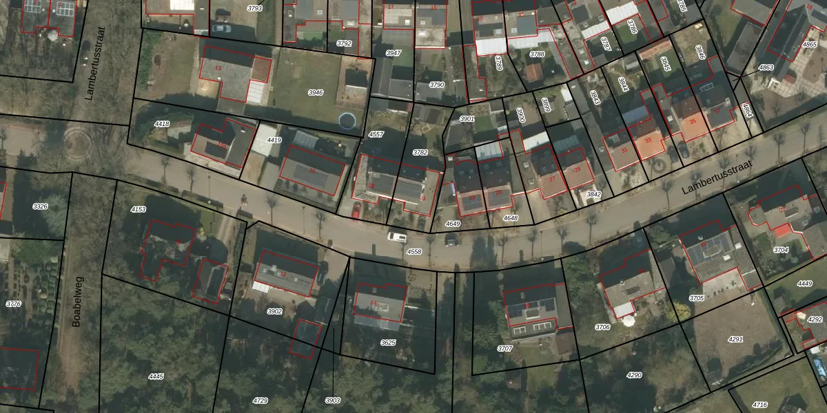 Het perceel waarop Lambertusstraat 21 staat heeft een oppervlakte van 315 m². Dit is een groot perceel. De perceeloppervlakte wordt geregistreerd door het Kadaster. Gedetailleerde informatie over de maten van dit perceel kunt u vinden in het rapport Kadastrale kaart met maatvoering van Lambertusstraat 21.