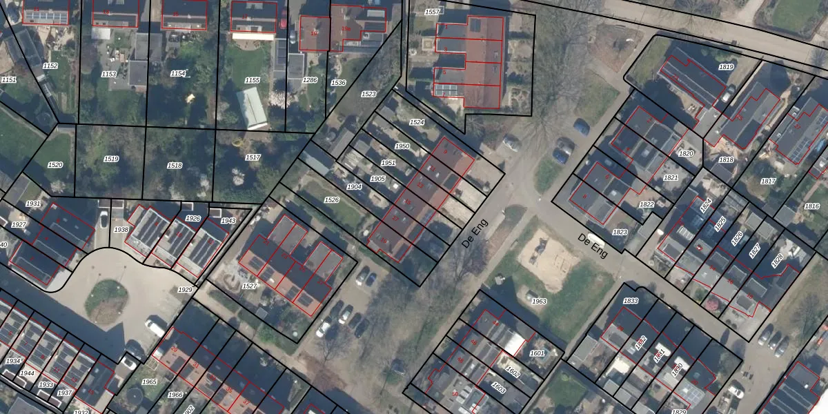 Het perceel waarop De Eng 15 staat heeft een oppervlakte van 175 m². Dit is een middelgroot perceel. De perceeloppervlakte wordt geregistreerd door het Kadaster. Gedetailleerde informatie over de maten van dit perceel kunt u vinden in het rapport Kadastrale kaart met maatvoering van De Eng 15.