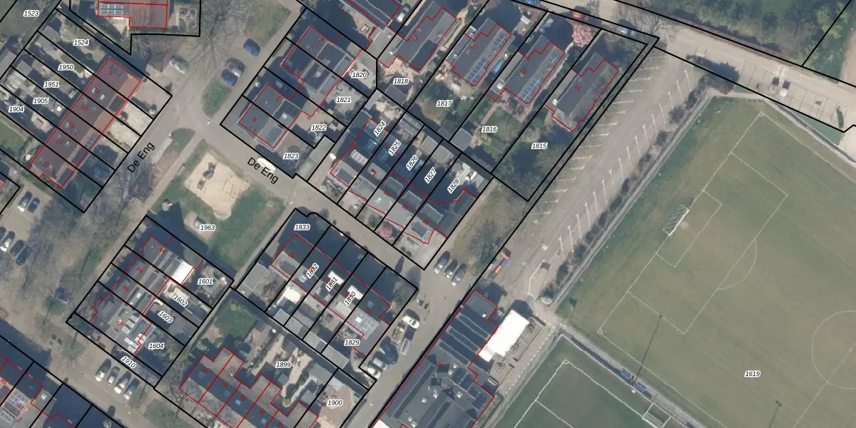 Het perceel waarop De Eng 18 staat heeft een oppervlakte van 255 m². Dit is een middelgroot perceel. De perceeloppervlakte wordt geregistreerd door het Kadaster. Gedetailleerde informatie over de maten van dit perceel kunt u vinden in het rapport Kadastrale kaart met maatvoering van De Eng 18.