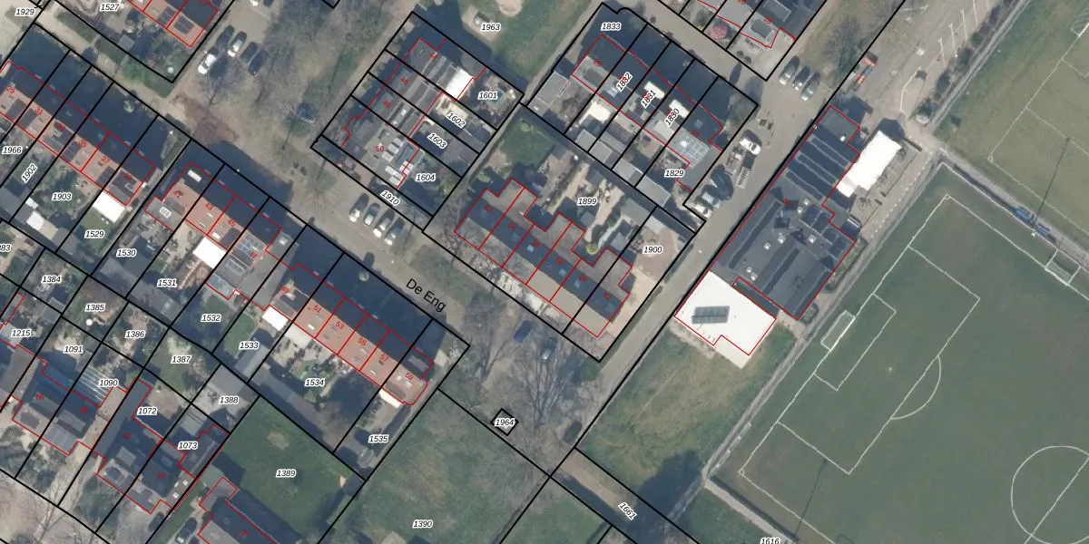 Het perceel waarop De Eng 58 staat heeft een oppervlakte van 950 m². Dit is een groot perceel. De perceeloppervlakte wordt geregistreerd door het Kadaster. Gedetailleerde informatie over de maten van dit perceel kunt u vinden in het rapport Kadastrale kaart met maatvoering van De Eng 58.