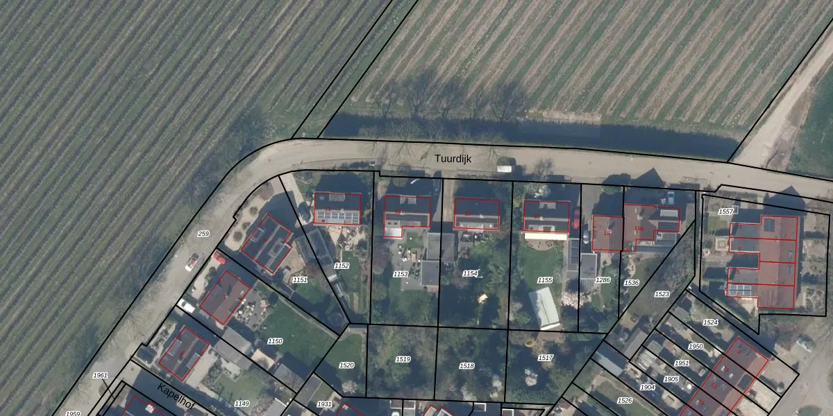 Het perceel waarop Tuurdijk 13 staat heeft een oppervlakte van 619 m². Dit is een groot perceel. De perceeloppervlakte wordt geregistreerd door het Kadaster. Gedetailleerde informatie over de maten van dit perceel kunt u vinden in het rapport Kadastrale kaart met maatvoering van Tuurdijk 13.