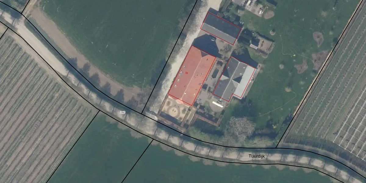 Het perceel waarop Tuurdijk 16 staat heeft een oppervlakte van 1,3 ha. Dit is een zeer groot perceel. De perceeloppervlakte wordt geregistreerd door het Kadaster. Gedetailleerde informatie over de maten van dit perceel kunt u vinden in het rapport Kadastrale kaart met maatvoering van Tuurdijk 16.
