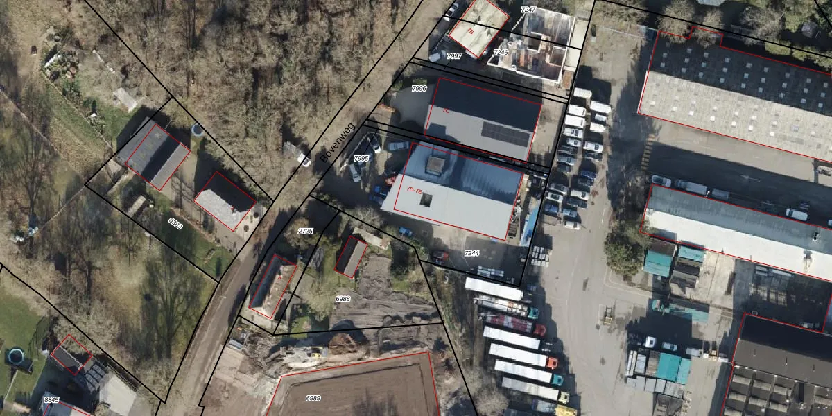 Het perceel waarop Bovenweg 7-E staat heeft een oppervlakte van 1290 m². Dit is een zeer groot perceel. De perceeloppervlakte wordt geregistreerd door het Kadaster. Gedetailleerde informatie over de maten van dit perceel kunt u vinden in het rapport Kadastrale kaart met maatvoering van Bovenweg 7-E.