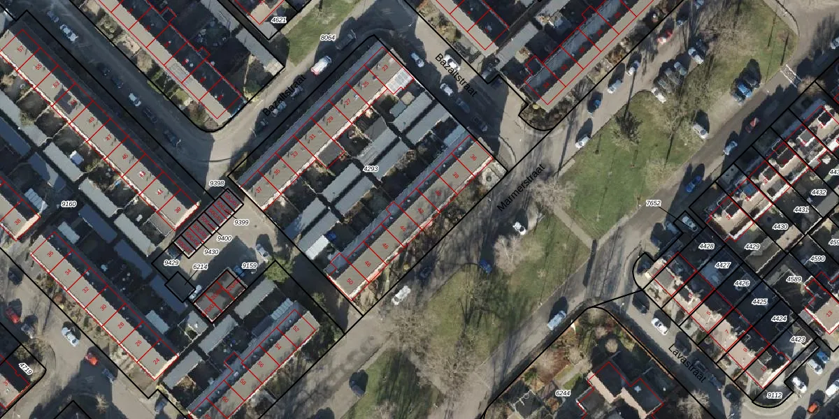 Het perceel waarop Marmerstraat 42 staat heeft een oppervlakte van 2250 m². Dit is een zeer groot perceel. De perceeloppervlakte wordt geregistreerd door het Kadaster. Gedetailleerde informatie over de maten van dit perceel kunt u vinden in het rapport Kadastrale kaart met maatvoering van Marmerstraat 42.