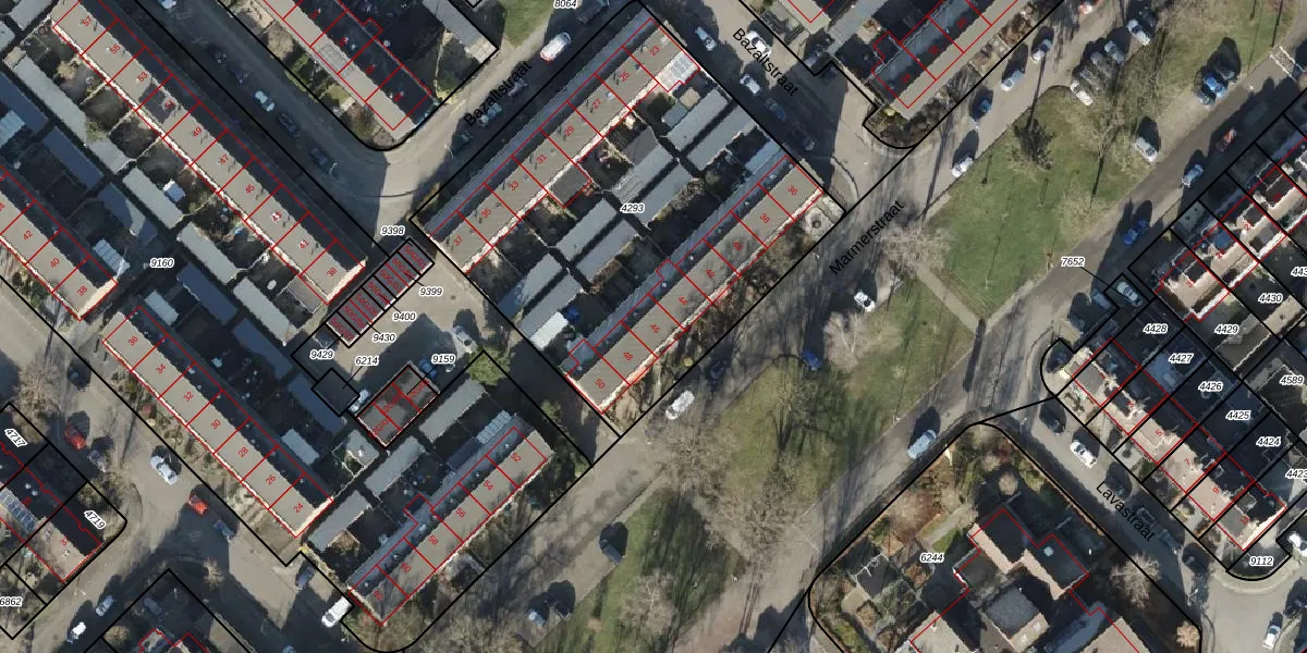 Het perceel waarop Marmerstraat 46 staat heeft een oppervlakte van 2250 m². Dit is een zeer groot perceel. De perceeloppervlakte wordt geregistreerd door het Kadaster. Gedetailleerde informatie over de maten van dit perceel kunt u vinden in het rapport Kadastrale kaart met maatvoering van Marmerstraat 46.