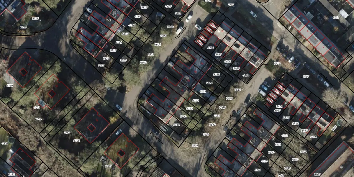 Het perceel waarop Travertin 24 staat heeft een oppervlakte van 183 m². Dit is een middelgroot perceel. De perceeloppervlakte wordt geregistreerd door het Kadaster. Gedetailleerde informatie over de maten van dit perceel kunt u vinden in het rapport Kadastrale kaart met maatvoering van Travertin 24.