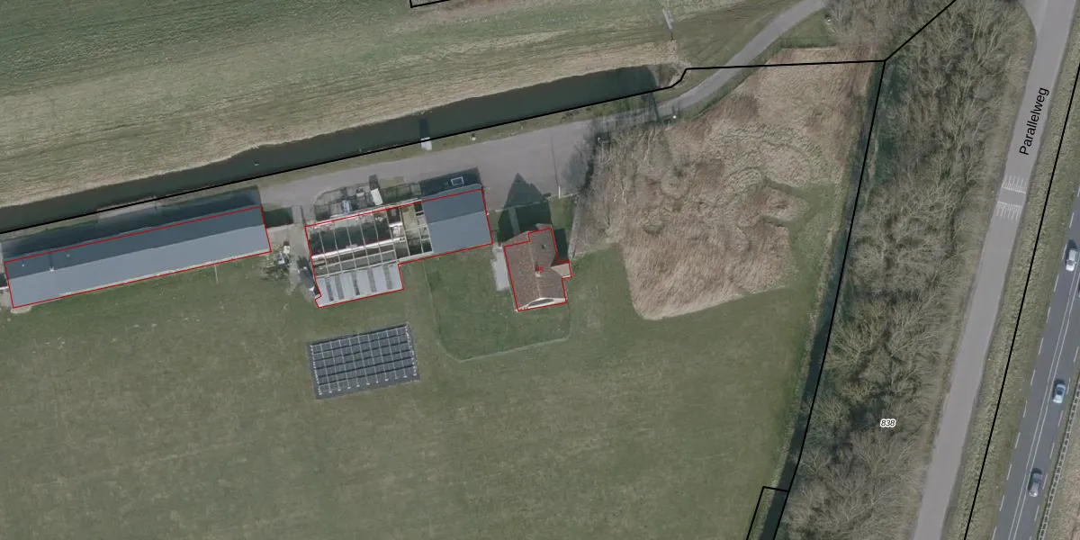 Het perceel waarop Parallelweg 45 staat heeft een oppervlakte van 4,9 ha. Dit is een zeer groot perceel. De perceeloppervlakte wordt geregistreerd door het Kadaster. Gedetailleerde informatie over de maten van dit perceel kunt u vinden in het rapport Kadastrale kaart met maatvoering van Parallelweg 45.