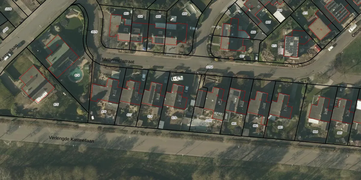 Het perceel waarop Metternichstraat 17 staat heeft een oppervlakte van 560 m². Dit is een groot perceel. De perceeloppervlakte wordt geregistreerd door het Kadaster. Gedetailleerde informatie over de maten van dit perceel kunt u vinden in het rapport Kadastrale kaart met maatvoering van Metternichstraat 17.