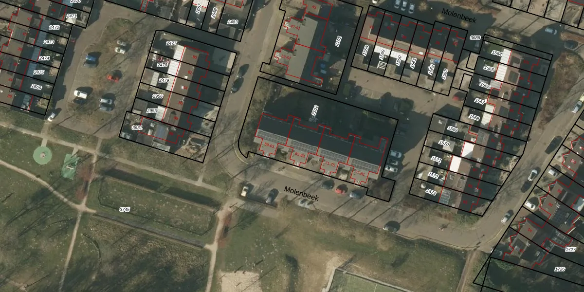 Het perceel waarop Molenbeek 65 staat heeft een oppervlakte van 1325 m². Dit is een zeer groot perceel. De perceeloppervlakte wordt geregistreerd door het Kadaster. Gedetailleerde informatie over de maten van dit perceel kunt u vinden in het rapport Kadastrale kaart met maatvoering van Molenbeek 65.