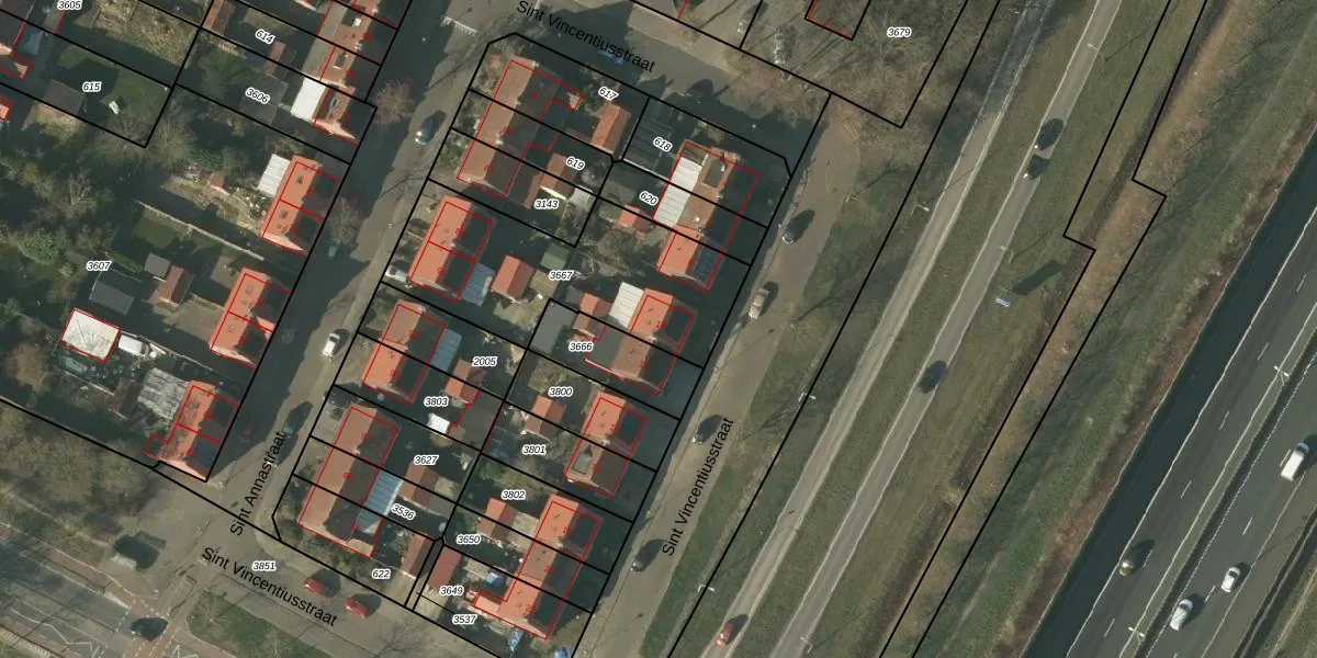 Het perceel waarop Sint Vincentiusstraat 10 staat heeft een oppervlakte van 860 m². Dit is een groot perceel. De perceeloppervlakte wordt geregistreerd door het Kadaster. Gedetailleerde informatie over de maten van dit perceel kunt u vinden in het rapport Kadastrale kaart met maatvoering van Sint Vincentiusstraat 10.