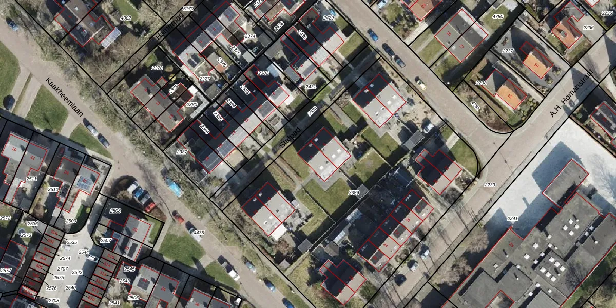 Het perceel waarop Stafpad 7 staat heeft een oppervlakte van 3755 m². Dit is een zeer groot perceel. De perceeloppervlakte wordt geregistreerd door het Kadaster. Gedetailleerde informatie over de maten van dit perceel kunt u vinden in het rapport Kadastrale kaart met maatvoering van Stafpad 7.