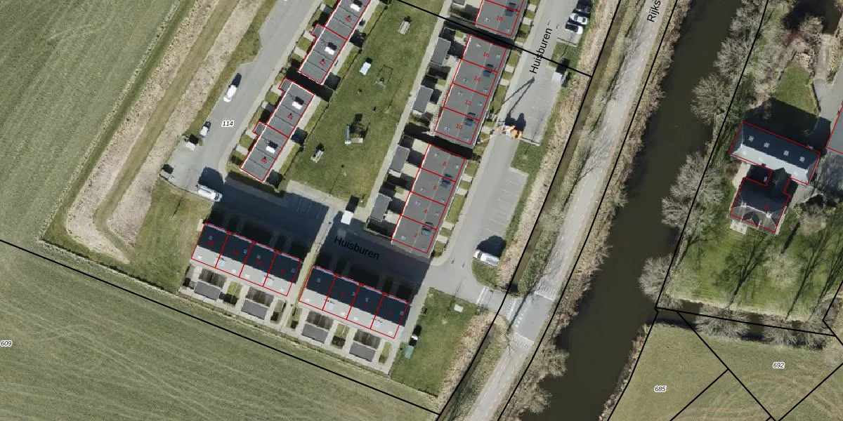 Het perceel waarop Huisburen 4 staat heeft een oppervlakte van 1,4 ha. Dit is een zeer groot perceel. De perceeloppervlakte wordt geregistreerd door het Kadaster. Gedetailleerde informatie over de maten van dit perceel kunt u vinden in het rapport Kadastrale kaart met maatvoering van Huisburen 4.