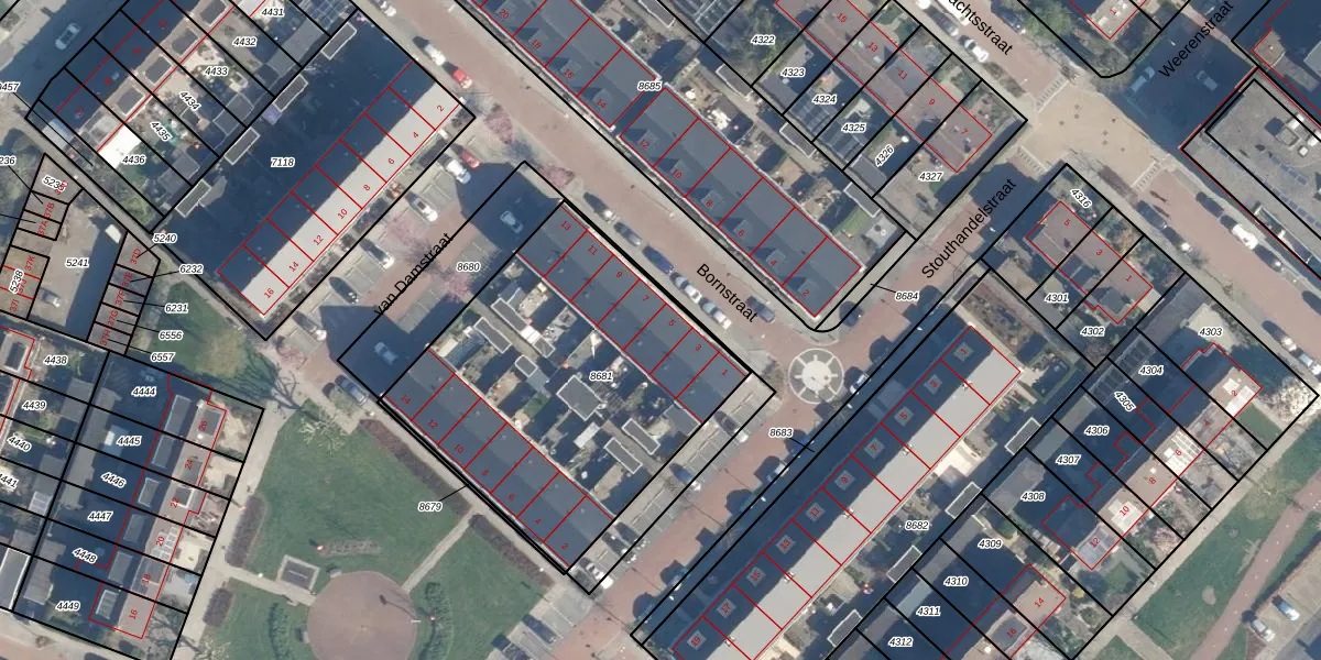 Het perceel waarop Bornstraat 5 staat heeft een oppervlakte van 1585 m². Dit is een zeer groot perceel. De perceeloppervlakte wordt geregistreerd door het Kadaster. Gedetailleerde informatie over de maten van dit perceel kunt u vinden in het rapport Kadastrale kaart met maatvoering van Bornstraat 5.