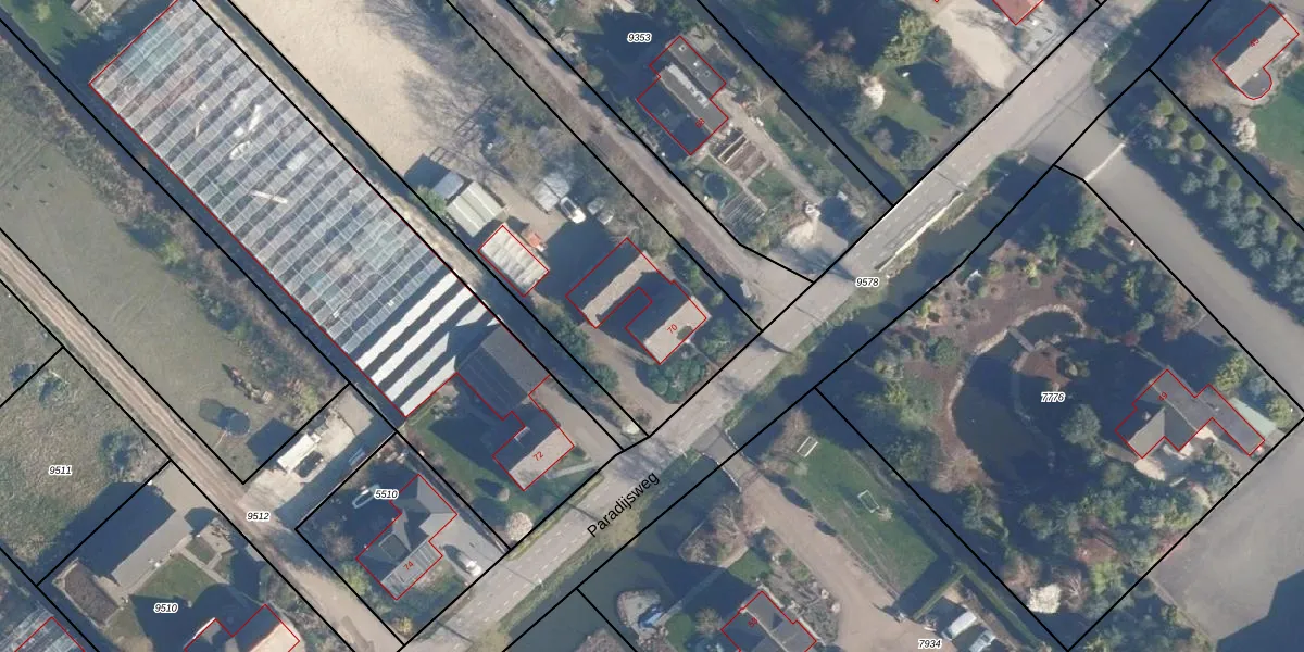 Het perceel waarop Paradijsweg 70 staat heeft een oppervlakte van 8180 m². Dit is een zeer groot perceel. De perceeloppervlakte wordt geregistreerd door het Kadaster. Gedetailleerde informatie over de maten van dit perceel kunt u vinden in het rapport Kadastrale kaart met maatvoering van Paradijsweg 70.