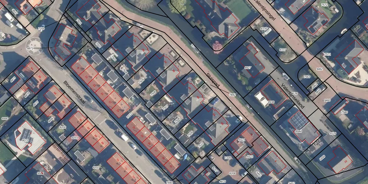 Het perceel waarop Sluispad 4-A staat heeft een oppervlakte van 313 m². Dit is een groot perceel. De perceeloppervlakte wordt geregistreerd door het Kadaster. Gedetailleerde informatie over de maten van dit perceel kunt u vinden in het rapport Kadastrale kaart met maatvoering van Sluispad 4-A.