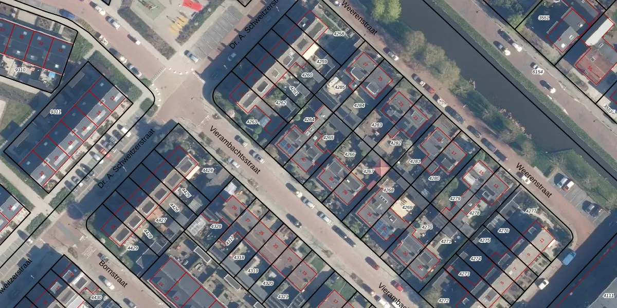 Vierambachtsstraat 40 is gelegen op kadastraal perceel AAR00A4265. Deze kadastrale aanduiding is uniek en wordt gebruikt door het Kadaster om eigendomsrechten en andere zakelijke rechten vast te leggen. Het perceel maakt onderdeel uit van de kadastrale gemeente Ter Aar.