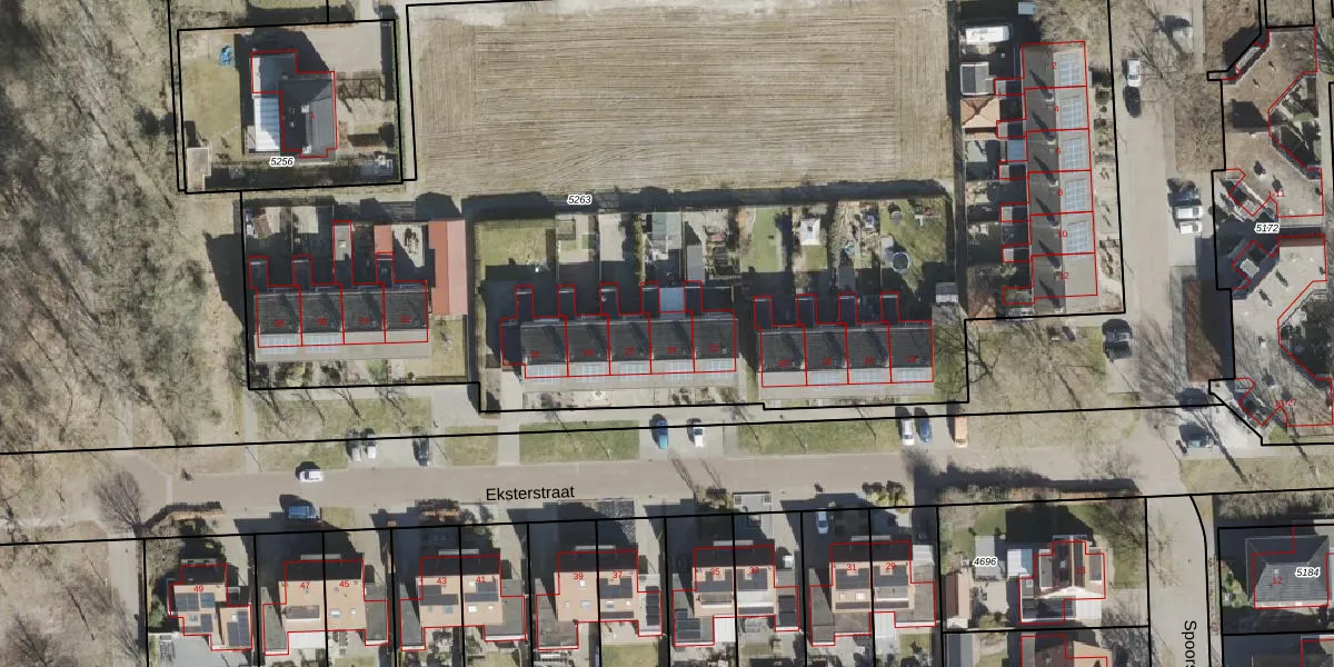 Het perceel waarop Eksterstraat 24 staat heeft een oppervlakte van 7012 m². Dit is een zeer groot perceel. De perceeloppervlakte wordt geregistreerd door het Kadaster. Gedetailleerde informatie over de maten van dit perceel kunt u vinden in het rapport Kadastrale kaart met maatvoering van Eksterstraat 24.