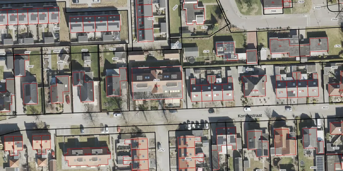 Het perceel waarop Koningstraat 45 staat heeft een oppervlakte van 1152 m². Dit is een zeer groot perceel. De perceeloppervlakte wordt geregistreerd door het Kadaster. Gedetailleerde informatie over de maten van dit perceel kunt u vinden in het rapport Kadastrale kaart met maatvoering van Koningstraat 45.