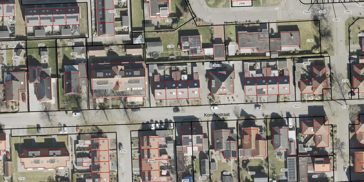 Het perceel waarop Koningstraat 63 staat heeft een oppervlakte van 1887 m². Dit is een zeer groot perceel. De perceeloppervlakte wordt geregistreerd door het Kadaster. Gedetailleerde informatie over de maten van dit perceel kunt u vinden in het rapport Kadastrale kaart met maatvoering van Koningstraat 63.