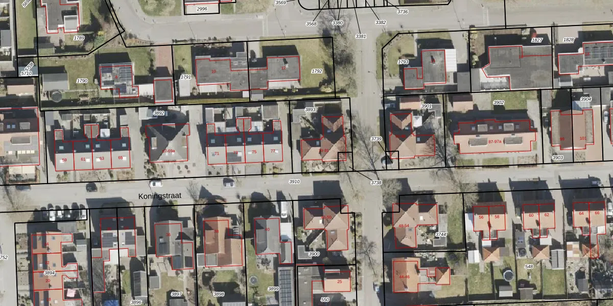 Het perceel waarop Koningstraat 79 staat heeft een oppervlakte van 443 m². Dit is een groot perceel. De perceeloppervlakte wordt geregistreerd door het Kadaster. Gedetailleerde informatie over de maten van dit perceel kunt u vinden in het rapport Kadastrale kaart met maatvoering van Koningstraat 79.