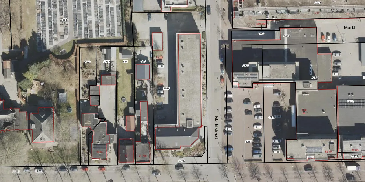 Het perceel waarop Marktstraat 53 staat heeft een oppervlakte van 2507 m². Dit is een zeer groot perceel. De perceeloppervlakte wordt geregistreerd door het Kadaster. Gedetailleerde informatie over de maten van dit perceel kunt u vinden in het rapport Kadastrale kaart met maatvoering van Marktstraat 53.