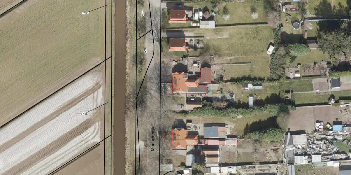 Het perceel waarop Munnekedijk 13 staat heeft een oppervlakte van 4,2 ha. Dit is een zeer groot perceel. De perceeloppervlakte wordt geregistreerd door het Kadaster. Gedetailleerde informatie over de maten van dit perceel kunt u vinden in het rapport Kadastrale kaart met maatvoering van Munnekedijk 13.