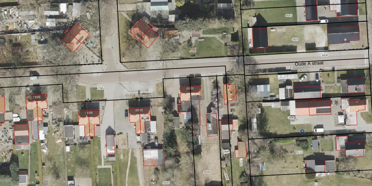 Het perceel waarop Oude A straat 9 staat heeft een oppervlakte van 9588 m². Dit is een zeer groot perceel. De perceeloppervlakte wordt geregistreerd door het Kadaster. Gedetailleerde informatie over de maten van dit perceel kunt u vinden in het rapport Kadastrale kaart met maatvoering van Oude A straat 9.