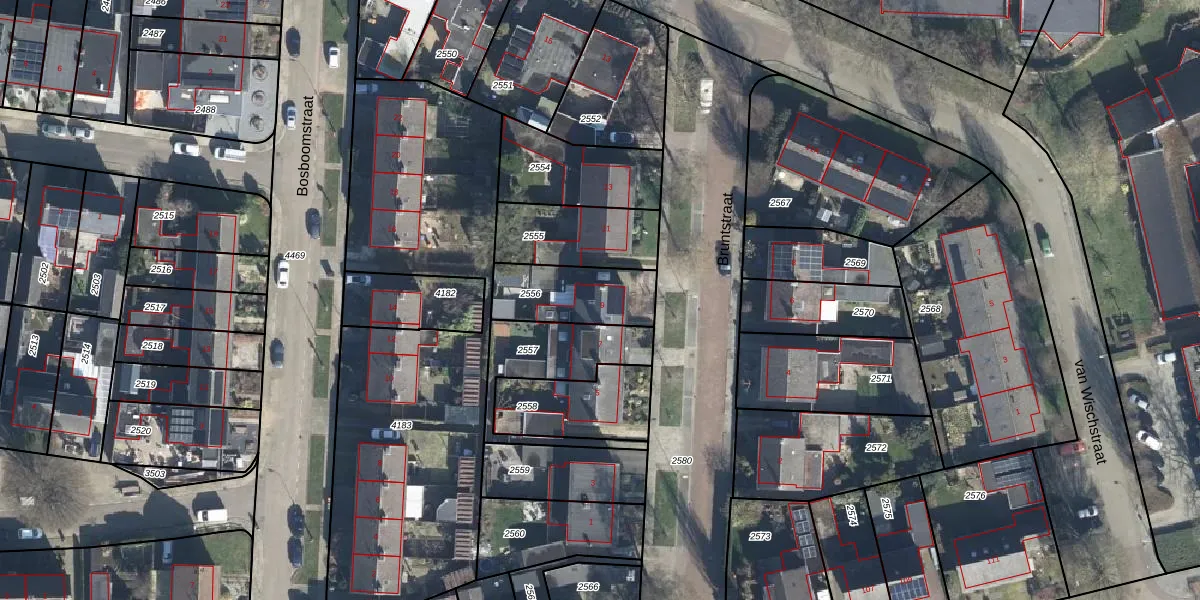Bruntstraat 9 is gelegen op kadastraal perceel WIS00F2556. Deze kadastrale aanduiding is uniek en wordt gebruikt door het Kadaster om eigendomsrechten en andere zakelijke rechten vast te leggen. Het perceel maakt onderdeel uit van de kadastrale gemeente Wisch.
