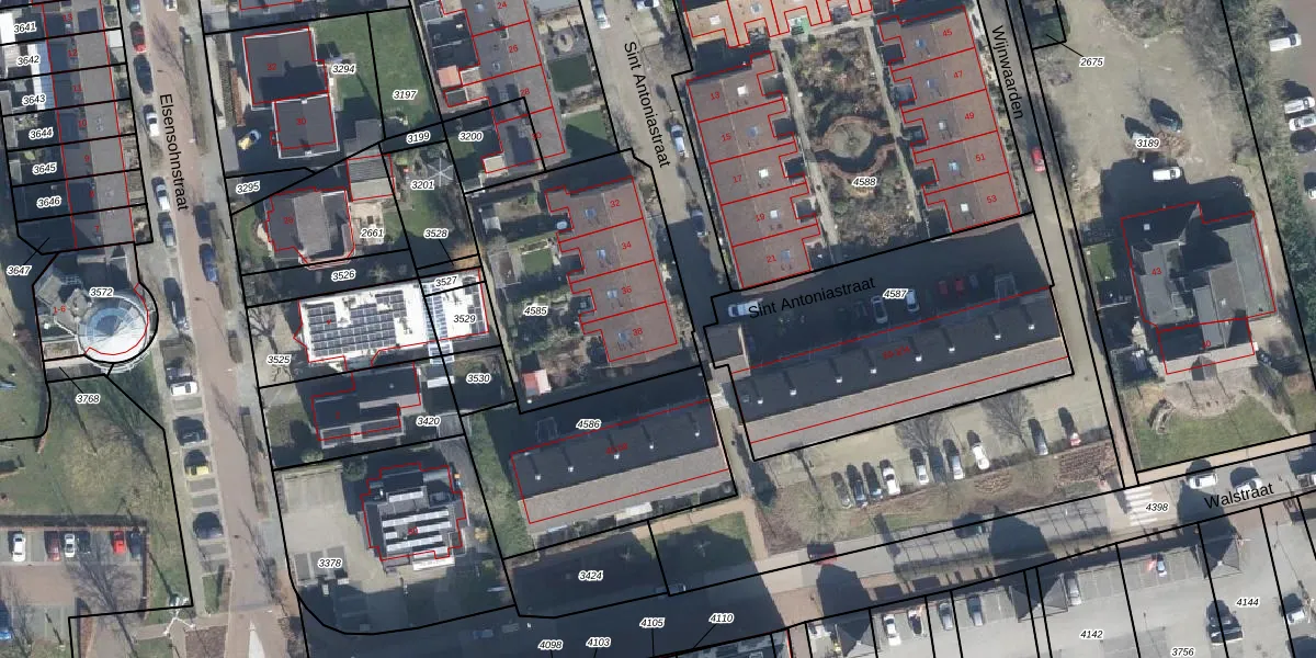 Het perceel waarop Sint Antoniastraat 38 staat heeft een oppervlakte van 990 m². Dit is een groot perceel. De perceeloppervlakte wordt geregistreerd door het Kadaster. Gedetailleerde informatie over de maten van dit perceel kunt u vinden in het rapport Kadastrale kaart met maatvoering van Sint Antoniastraat 38.