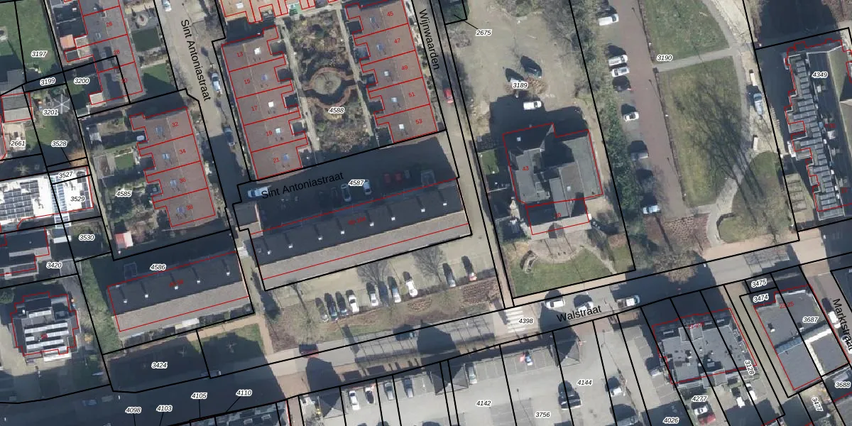 Het perceel waarop Sint Antoniastraat 86 staat heeft een oppervlakte van 1299 m². Dit is een zeer groot perceel. De perceeloppervlakte wordt geregistreerd door het Kadaster. Gedetailleerde informatie over de maten van dit perceel kunt u vinden in het rapport Kadastrale kaart met maatvoering van Sint Antoniastraat 86.