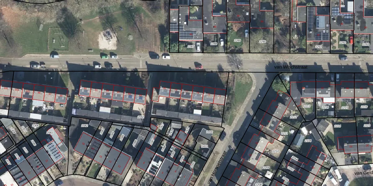 Het perceel waarop van Wischstraat 77 staat heeft een oppervlakte van 3157 m². Dit is een zeer groot perceel. De perceeloppervlakte wordt geregistreerd door het Kadaster. Gedetailleerde informatie over de maten van dit perceel kunt u vinden in het rapport Kadastrale kaart met maatvoering van van Wischstraat 77.