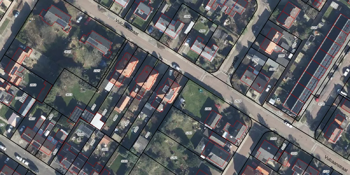 Het perceel waarop Vulcaanstraat 39 staat heeft een oppervlakte van 360 m². Dit is een groot perceel. De perceeloppervlakte wordt geregistreerd door het Kadaster. Gedetailleerde informatie over de maten van dit perceel kunt u vinden in het rapport Kadastrale kaart met maatvoering van Vulcaanstraat 39.