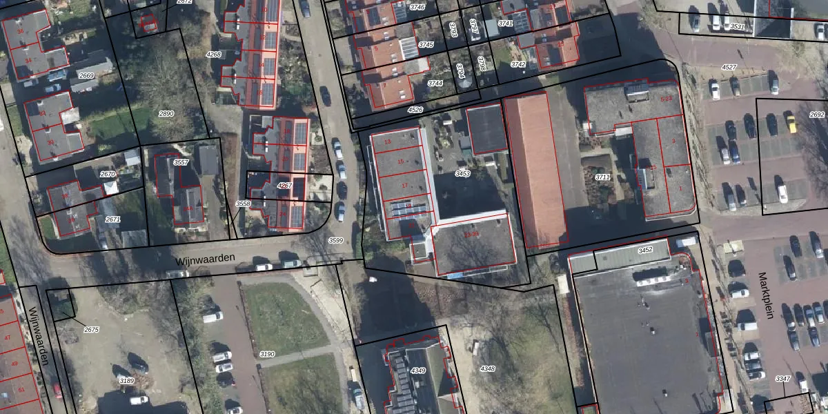 Het perceel waarop Wijnwaarden 19 staat heeft een oppervlakte van 1477 m². Dit is een zeer groot perceel. De perceeloppervlakte wordt geregistreerd door het Kadaster. Gedetailleerde informatie over de maten van dit perceel kunt u vinden in het rapport Kadastrale kaart met maatvoering van Wijnwaarden 19.