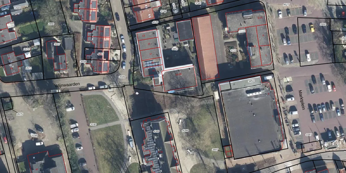Het perceel waarop Wijnwaarden 35 staat heeft een oppervlakte van 1477 m². Dit is een zeer groot perceel. De perceeloppervlakte wordt geregistreerd door het Kadaster. Gedetailleerde informatie over de maten van dit perceel kunt u vinden in het rapport Kadastrale kaart met maatvoering van Wijnwaarden 35.