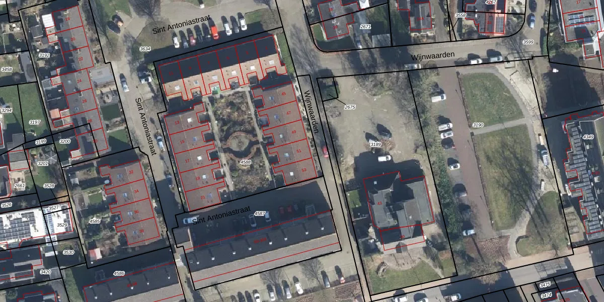 Het perceel waarop Wijnwaarden 51 staat heeft een oppervlakte van 2380 m². Dit is een zeer groot perceel. De perceeloppervlakte wordt geregistreerd door het Kadaster. Gedetailleerde informatie over de maten van dit perceel kunt u vinden in het rapport Kadastrale kaart met maatvoering van Wijnwaarden 51.
