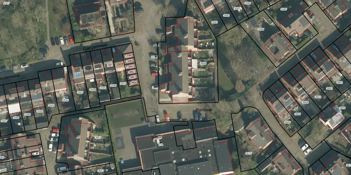 Het perceel waarop Buntlaar 7 staat heeft een oppervlakte van 1628 m². Dit is een zeer groot perceel. De perceeloppervlakte wordt geregistreerd door het Kadaster. Gedetailleerde informatie over de maten van dit perceel kunt u vinden in het rapport Kadastrale kaart met maatvoering van Buntlaar 7.