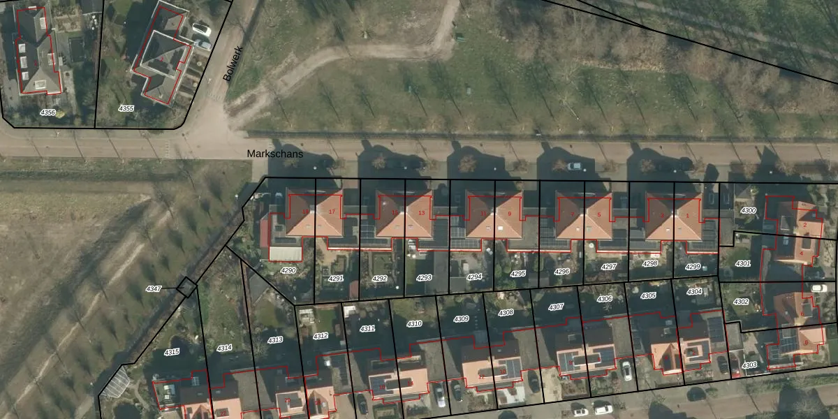 Het perceel waarop Markschans 13 staat heeft een oppervlakte van 300 m². Dit is een groot perceel. De perceeloppervlakte wordt geregistreerd door het Kadaster. Gedetailleerde informatie over de maten van dit perceel kunt u vinden in het rapport Kadastrale kaart met maatvoering van Markschans 13.
