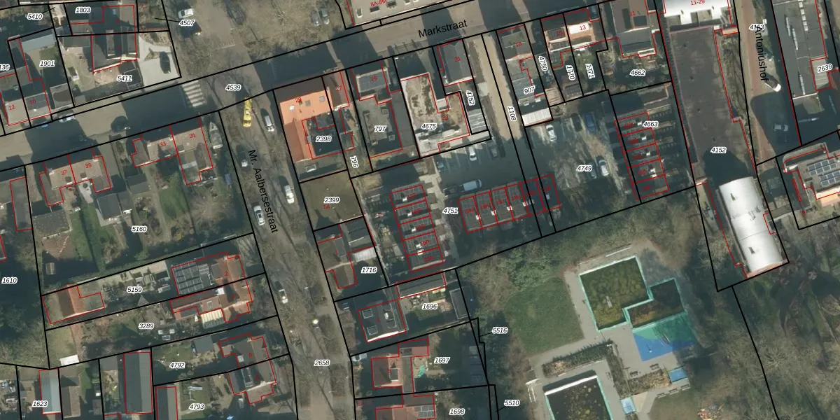 Het perceel waarop Markstraat 19-S staat heeft een oppervlakte van 1175 m². Dit is een zeer groot perceel. De perceeloppervlakte wordt geregistreerd door het Kadaster. Gedetailleerde informatie over de maten van dit perceel kunt u vinden in het rapport Kadastrale kaart met maatvoering van Markstraat 19-S.