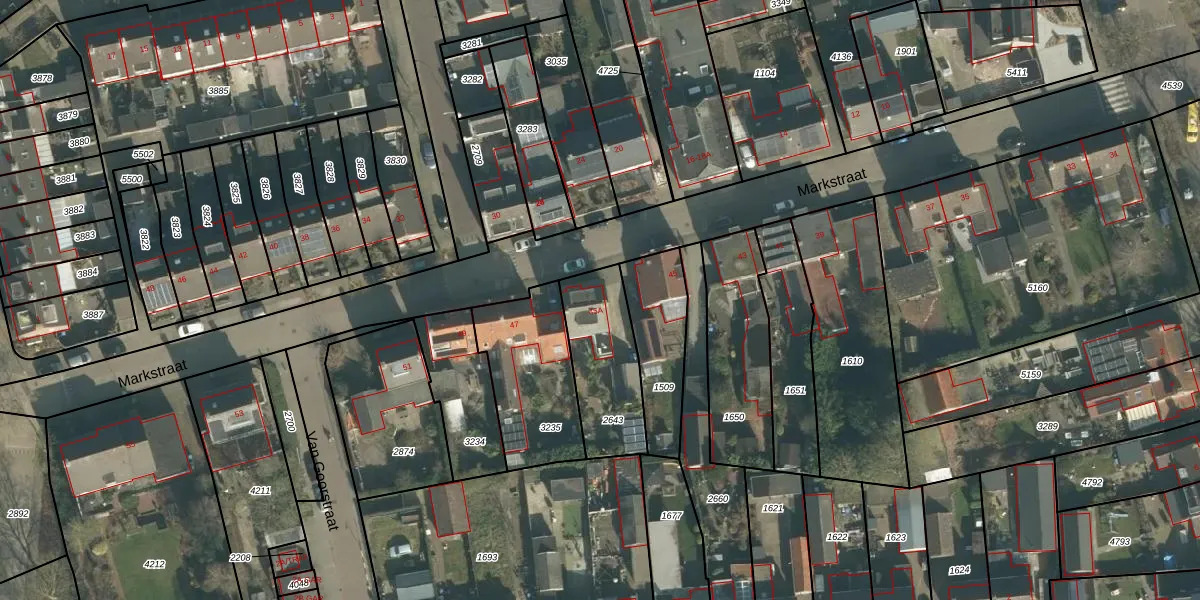 Markstraat 45-A is gelegen op kadastraal perceel THD00G2643. Deze kadastrale aanduiding is uniek en wordt gebruikt door het Kadaster om eigendomsrechten en andere zakelijke rechten vast te leggen. Het perceel maakt onderdeel uit van de kadastrale gemeente Terheijden.