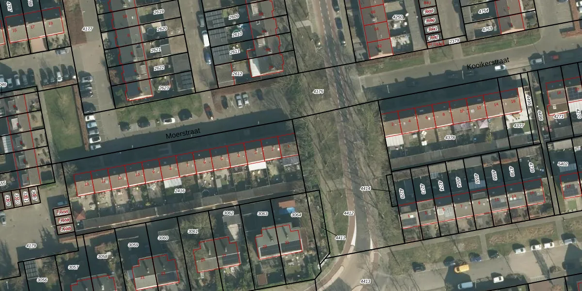 Het perceel waarop Moerstraat 1 staat heeft een oppervlakte van 2040 m². Dit is een zeer groot perceel. De perceeloppervlakte wordt geregistreerd door het Kadaster. Gedetailleerde informatie over de maten van dit perceel kunt u vinden in het rapport Kadastrale kaart met maatvoering van Moerstraat 1.