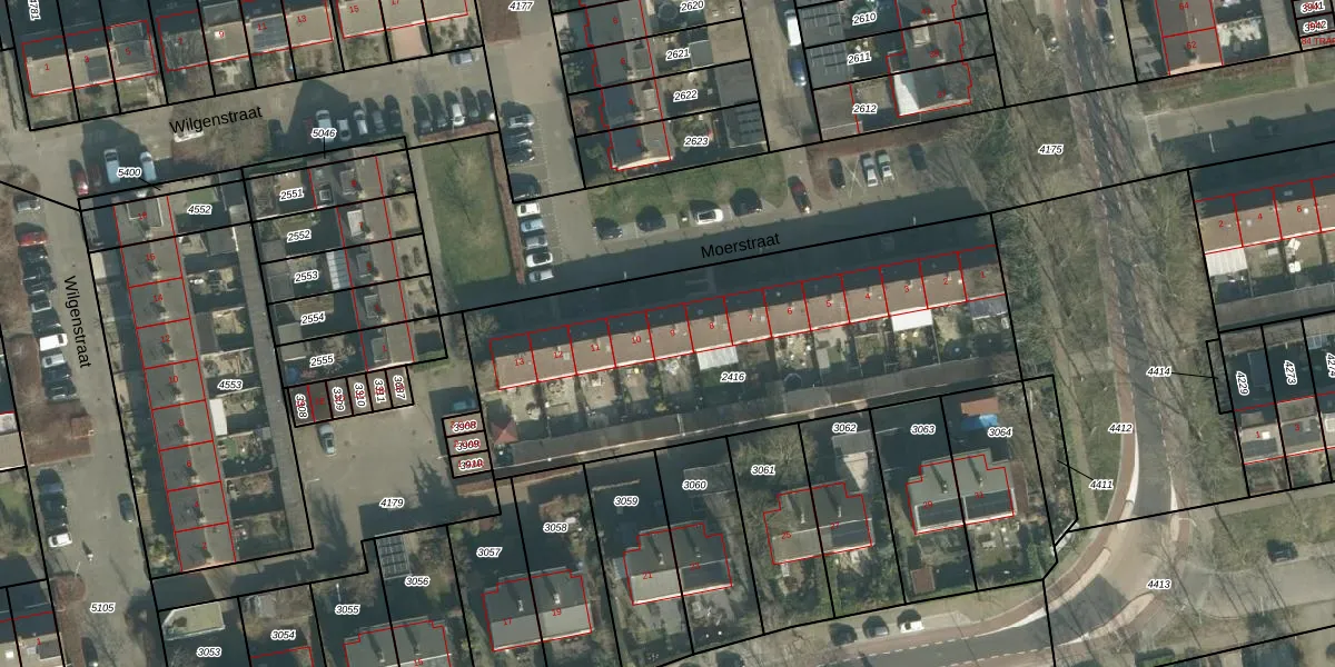 Het perceel waarop Moerstraat 9 staat heeft een oppervlakte van 2040 m². Dit is een zeer groot perceel. De perceeloppervlakte wordt geregistreerd door het Kadaster. Gedetailleerde informatie over de maten van dit perceel kunt u vinden in het rapport Kadastrale kaart met maatvoering van Moerstraat 9.