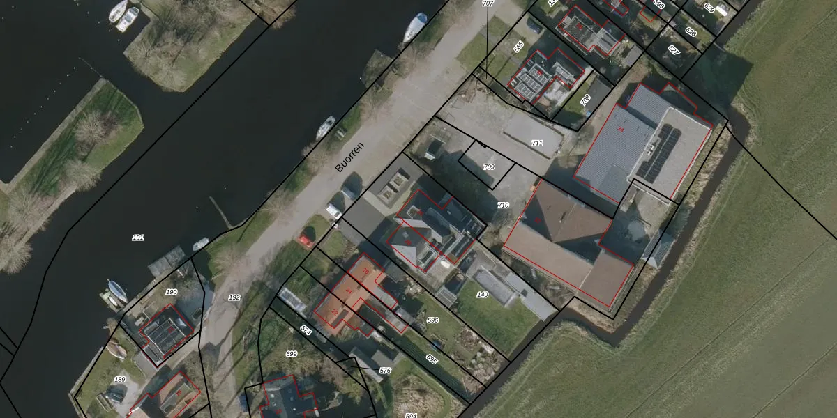 Het perceel waarop Buorren 30 staat heeft een oppervlakte van 1025 m². Dit is een zeer groot perceel. De perceeloppervlakte wordt geregistreerd door het Kadaster. Gedetailleerde informatie over de maten van dit perceel kunt u vinden in het rapport Kadastrale kaart met maatvoering van Buorren 30.