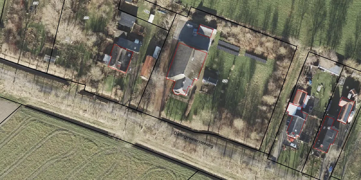 Het perceel waarop Dallingeweersterweg 14 staat heeft een oppervlakte van 4315 m². Dit is een zeer groot perceel. De perceeloppervlakte wordt geregistreerd door het Kadaster. Gedetailleerde informatie over de maten van dit perceel kunt u vinden in het rapport Kadastrale kaart met maatvoering van Dallingeweersterweg 14.
