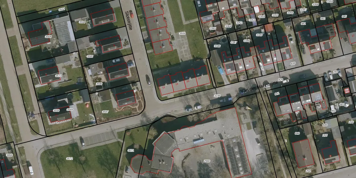 Het perceel waarop Slotstrjitte 13 staat heeft een oppervlakte van 2035 m². Dit is een zeer groot perceel. De perceeloppervlakte wordt geregistreerd door het Kadaster. Gedetailleerde informatie over de maten van dit perceel kunt u vinden in het rapport Kadastrale kaart met maatvoering van Slotstrjitte 13.