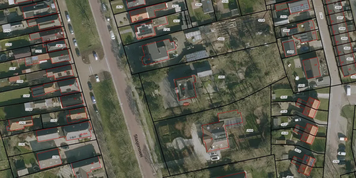 Het perceel waarop Stasjonswei 29 staat heeft een oppervlakte van 2150 m². Dit is een zeer groot perceel. De perceeloppervlakte wordt geregistreerd door het Kadaster. Gedetailleerde informatie over de maten van dit perceel kunt u vinden in het rapport Kadastrale kaart met maatvoering van Stasjonswei 29.