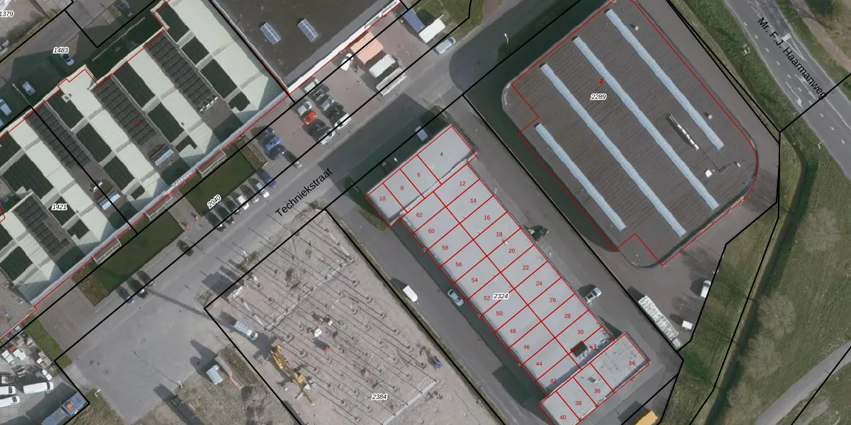 Het perceel waarop Techniekstraat 62 staat heeft een oppervlakte van 3518 m². Dit is een zeer groot perceel. De perceeloppervlakte wordt geregistreerd door het Kadaster. Gedetailleerde informatie over de maten van dit perceel kunt u vinden in het rapport Kadastrale kaart met maatvoering van Techniekstraat 62.