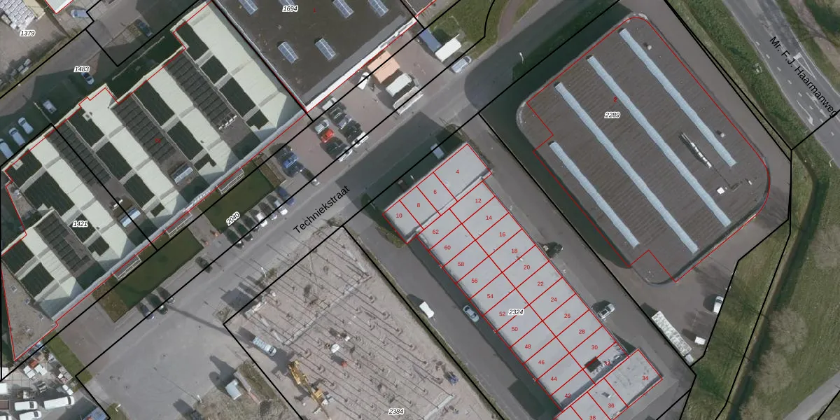 Het perceel waarop Techniekstraat 8 staat heeft een oppervlakte van 3518 m². Dit is een zeer groot perceel. De perceeloppervlakte wordt geregistreerd door het Kadaster. Gedetailleerde informatie over de maten van dit perceel kunt u vinden in het rapport Kadastrale kaart met maatvoering van Techniekstraat 8.